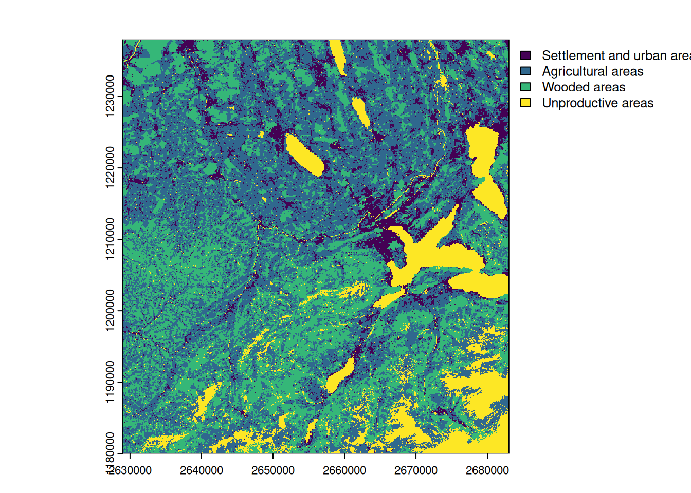 - The resulting raster contains the integer values 1 to 4. These values correspond to the following land use categories (see metadata):